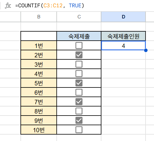 =COUNTIF(C2:C30, TRUE)라고 입력하면, C열에서 체크된 박스 개수(제출자 수)가 자동으로 계산됩니다.