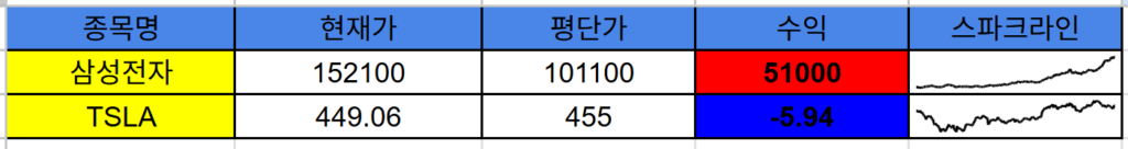 엔터를 치는 순간, 셀 안에 작은 꺾은선 그래프가 짠! 하고 나타납니다. (005930 자리에 테슬라 티커 TSLA를 넣으면 테슬라 차트가 그려집니다.)