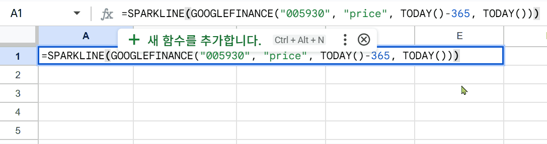 =SPARKLINE(GOOGLEFINANCE(“005930”, “price”, TODAY()-365, TODAY()))