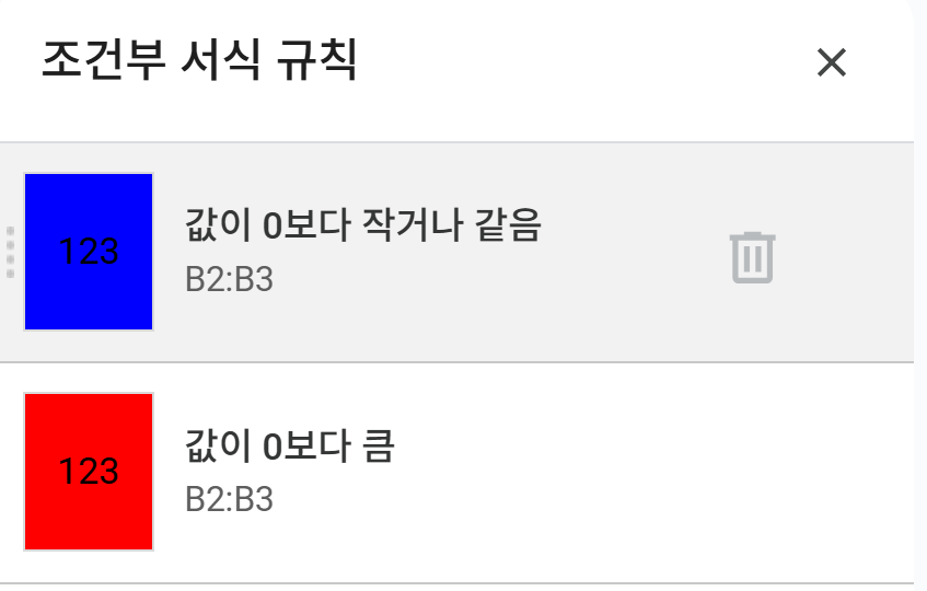 - 형식 규칙: [초과] 선택 후, 0 입력