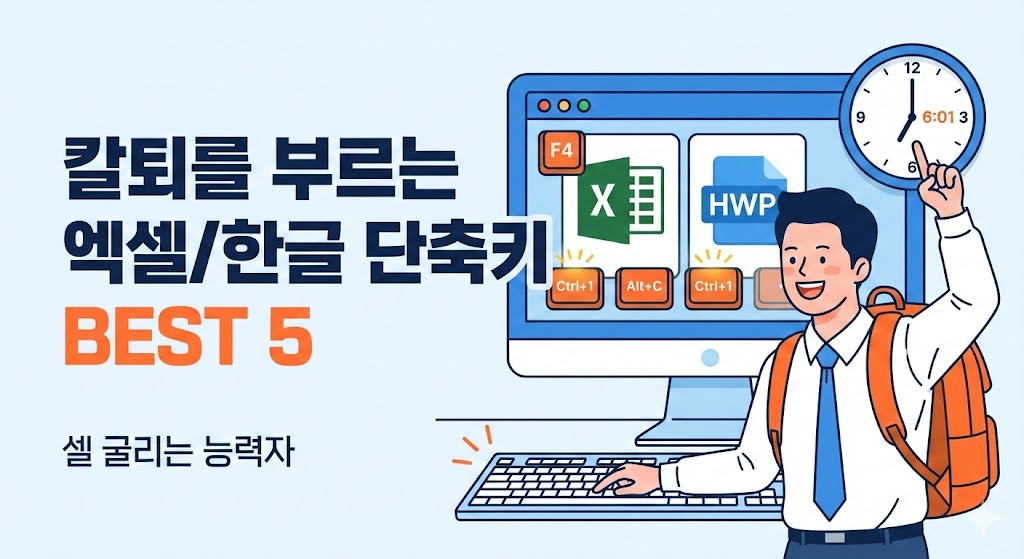 직장인과 교사를 위한 필수 엑셀 한글 단축키 5가지를 소개합니다. 마우스 사용을 줄이고 업무 속도를 2배로 높여 칼퇴하세요. F4, Alt+C 등 실무 핵심 단축키 총정리.